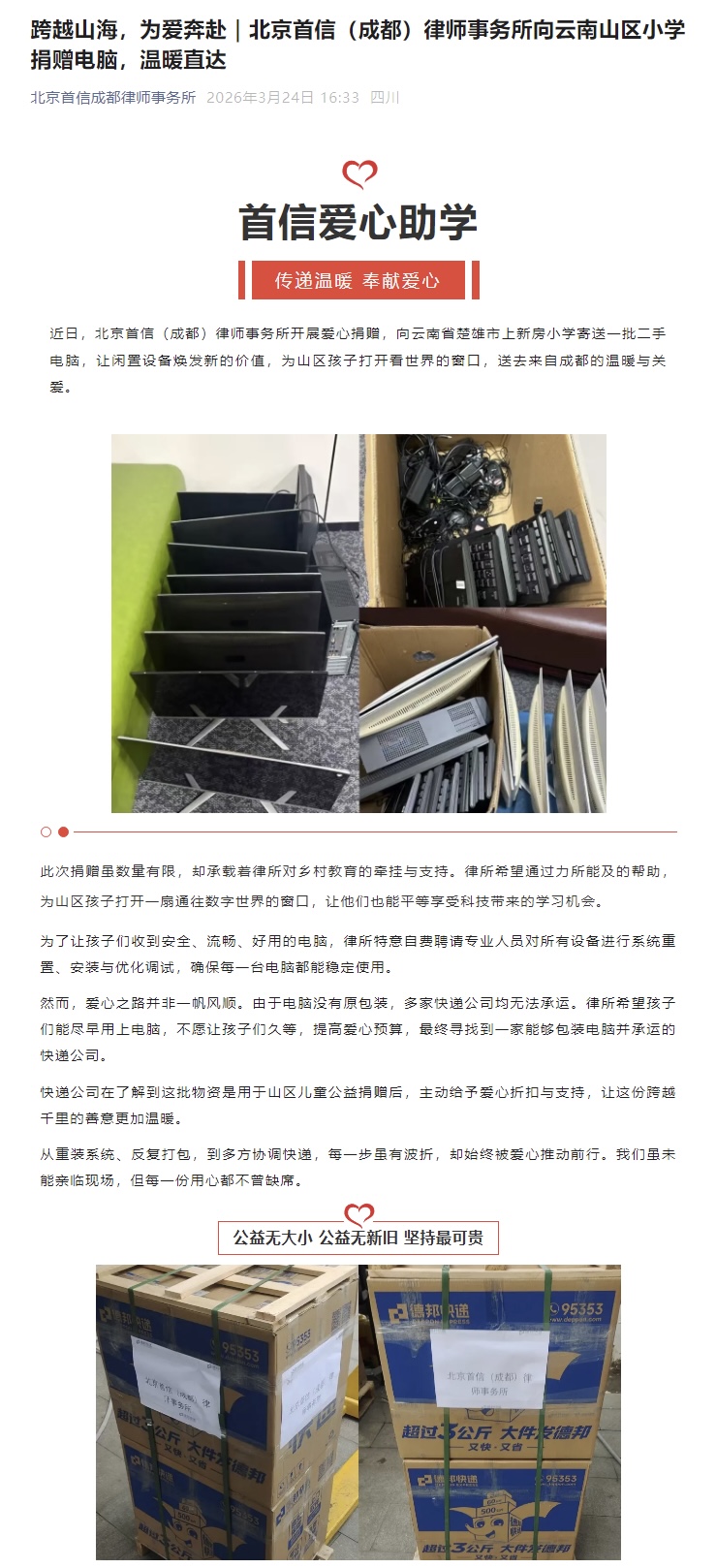 近日,北京首信(成都)律师事务所开展爱心捐赠,向云南省楚雄市上新房小学寄送一批二手电脑,让闲置设备焕发新的价值,为山区孩子打开看世界的窗口,送去来自成都的温暖与关爱。